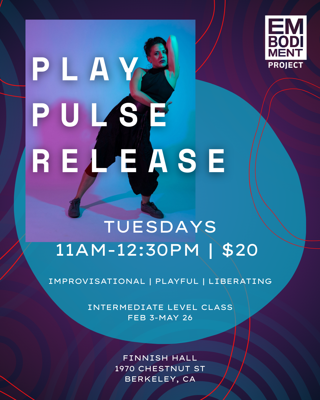 Play, Pulse & Release is an intermediate-level class that expands theatrical range and performance quality through house and release technique. Blending informed choreography, improvisation, and playful, liberating movement, the class develops expressive range and emotional clarity through dynamic, rhythm-driven work.